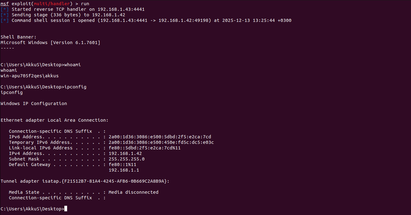 Reverse-TCP.exe adlı zararlı çalıştırıldığınızda hazır olan handler başarıyla uzak kabuk oturumunu yakalayarak hedef cihazın komut yürütme ortamını bize yansıtmaktadır.