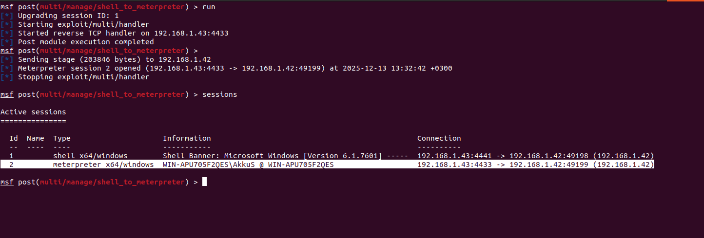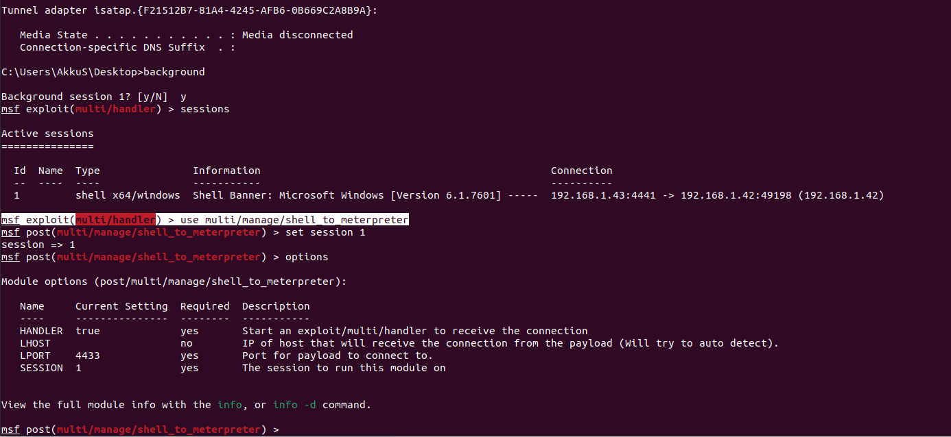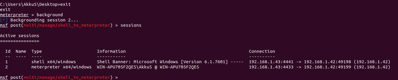 Oturumu arka plana gönderdikten sonra use multi/manage/shell_to_meterpreter ile modülü aktif edebiliriz.