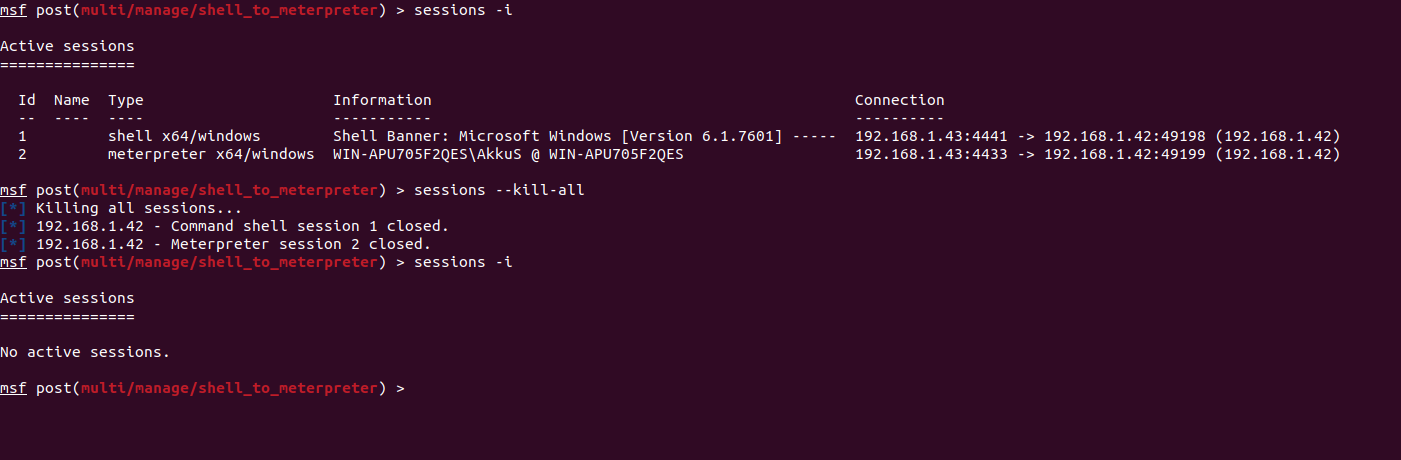 Pentestimizi sonlandırmak için tüm oturumları kapatmayı unutmayalım. sessions --kill-all komutundan faydalanabiliriz.
