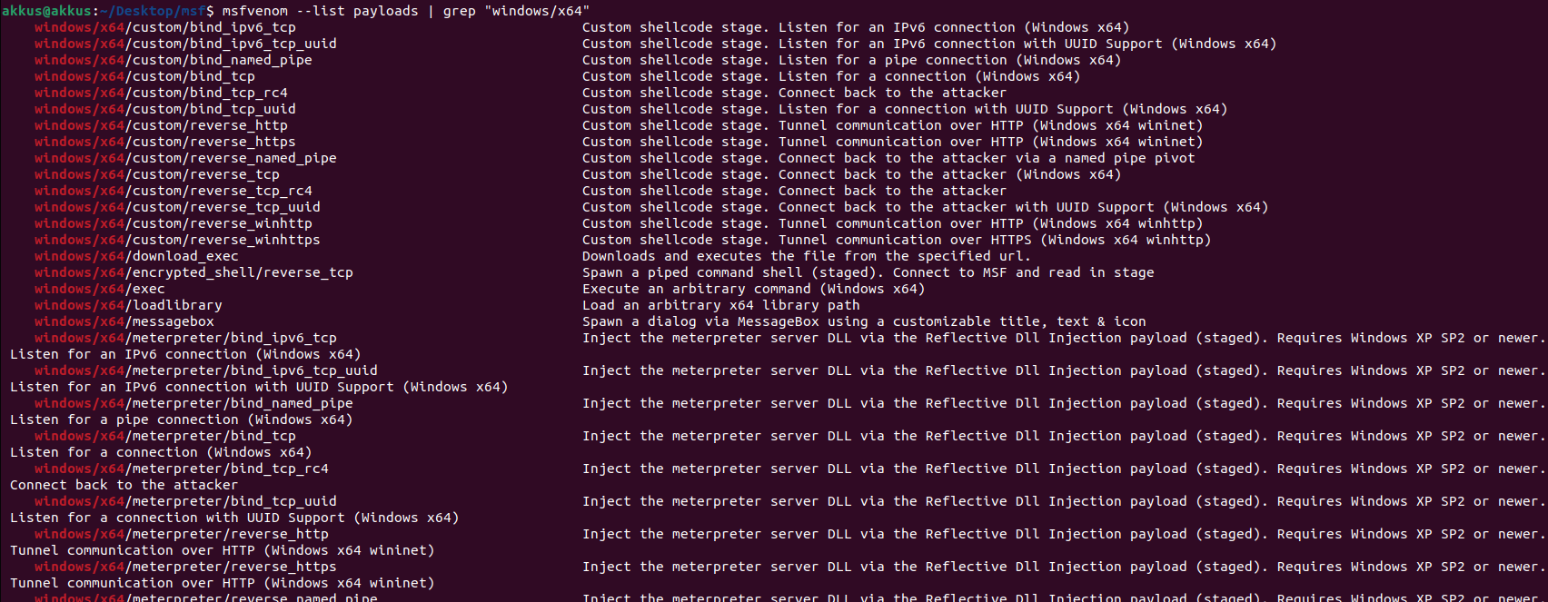 Örneğin windows/x64/shell/reverse_tcp veya windows/x64/meterpreter/reverse_tcp bizim zararlı kodumuz olabilir.