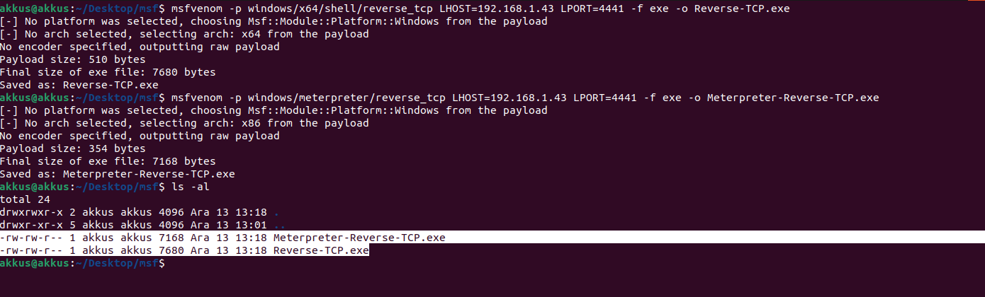 Payload seçimlerini gerçekleştirmiştik. Aşağıdaki gibi bir komutla zararlı yazılımlarımızı üretebiliriz.