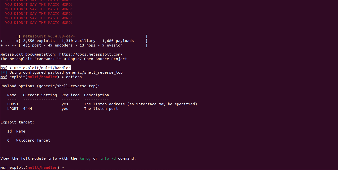Bizim kullanacağımız ise exploit kategorisinde yer alan ve "multi" yani bir çok amaç ve türe dayanan "handler/işleyici" modülü olacaktır. Aşağıdaki gibi msfconsole use komutu ile aktifleştirebilir ve options komutu ile de detaylarını görebiliriz.