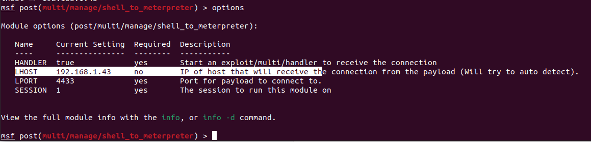 set session 1 komutuyla oturuma ait ID değerini modüle atamamız gerekiyor ve elde edeceğimiz yeni Meterpreter oturumunun ise mevcut oturum için kullandığımız Port ile çakışmaması gerekiyor. Dolayısıyla LHOST için önceden kullandığımız ve aktif oturumumuzun yer aldığı 4441 nolu kapıyı kullanmayacağız. Herhangi bir port atayabilirsiniz. Yine LHOST için ise bizim yani saldırganın IP adresinin atamasının yapılması gerekiyor.