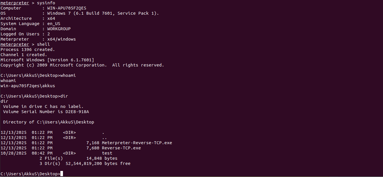 Örneğin ilk zararlımız olan Reverse-TCP.exe çalışmış olsun ve sıradan bir uzak kabuk erişimi elde etmiş olalım.