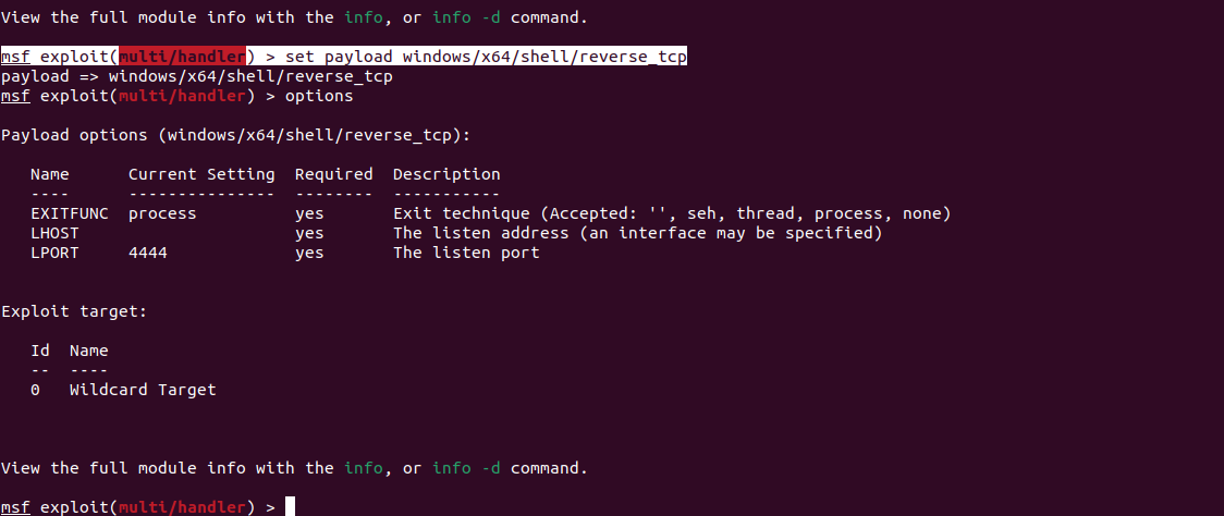 Görüldüğü üzere LHOST, LPORT gibi değerler beklemektedir. Bu ayarlar aslında Payload options için tanımlanan payload türüne bağlıdır.