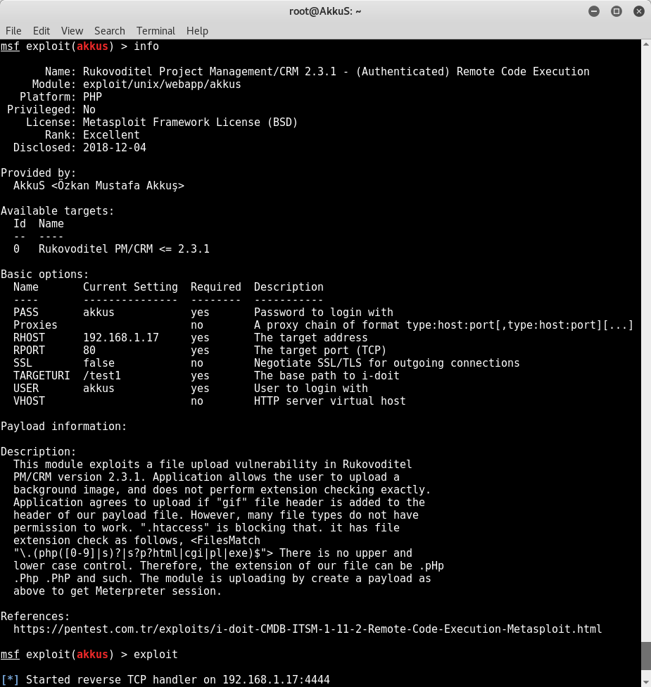 This module exploits a file upload vulnerability in Rukovoditel PM/CRM version 2.3.1.